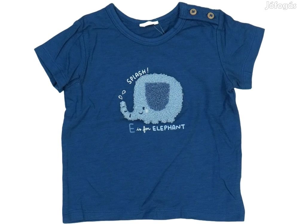 Kék színű baba póló elefánt mintával és 'SPLASH!' felirattal. A póló elején egy aranyos elefánt motívum látható, amely vízsugarat fröcsköl az ormányából. Az elefánt alatt az 'E is for ELEPHANT' szöveg olvasható. A póló vállánál két gomb található a könnyebb fel- és levételért. Puha pamut anyagból készült, kényelmes viselet a legkisebbeknek. A színes, bolyhos dizájn játékos és vidám hangulatot teremt, tökéletes mindennapi viseletre. Minta: Elefánt mintás, Feliratos; Jellemzők: Gombos a vállán; Anyagtípus: Bolyhos anyagú; Nyaktípus: Környakú