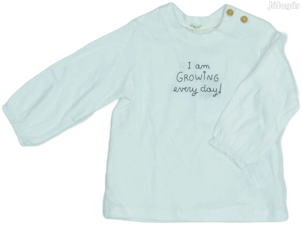 Gyönyörű hosszú ujjú felső kislányoknak, amely puha pamut anyagból készült. A ruhadarab különleges vonzereje az elején található feliratban rejlik: 'I am GROWING every day!' - egy inspiráló üzenet, amely a gyermekek fejlődését ünnepli. A kerek kivágású nyak, és praktikus gombokkal zárható a vállnál, ami megkönnyíti a fel- és levételt. Az ujjak kényelmesen hosszúak, tökéletesek a hűvösebb napokra, gumis szegéllyel. A kellemes, lágy textúra és a semleges színvilág miatt sokoldalúan kombinálható különböző ruhadarabokkal. Ideális választás mindennapi viselethez.