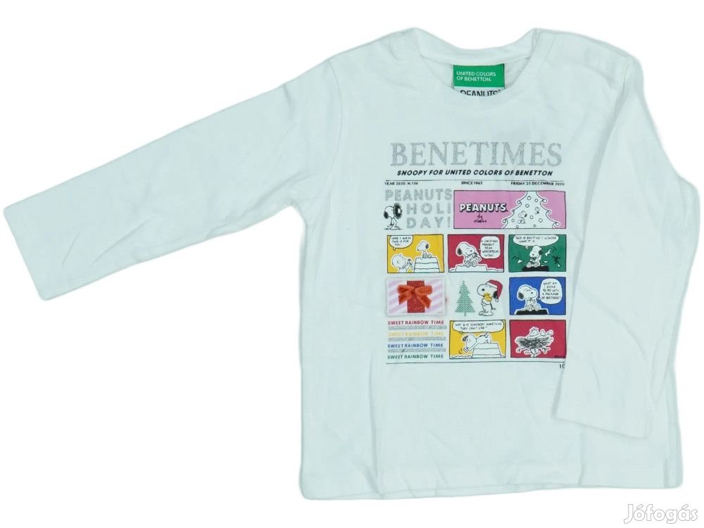 Elegáns hosszú ujjú felső gyermekeknek, mely a népszerű Snoopy karakterrel és színes képregény stílusú grafikával díszített. A póló elején 'BENETIMES' felirat látható, alatta pedig 'SNOOPY FOR UNITED COLORS OF BENETTON' szöveg. A központi grafika kilenc kisebb képet tartalmaz különböző színes keretekben, amelyek Snoopy különböző jeleneteit mutatják be, beleértve karácsonyi és téli témákat. A felső környakú, normál hosszúságú és kényelmes viselet mindennapi használatra. Benetton márkájú, minőségi pamut anyagból készült gyermekruházat.