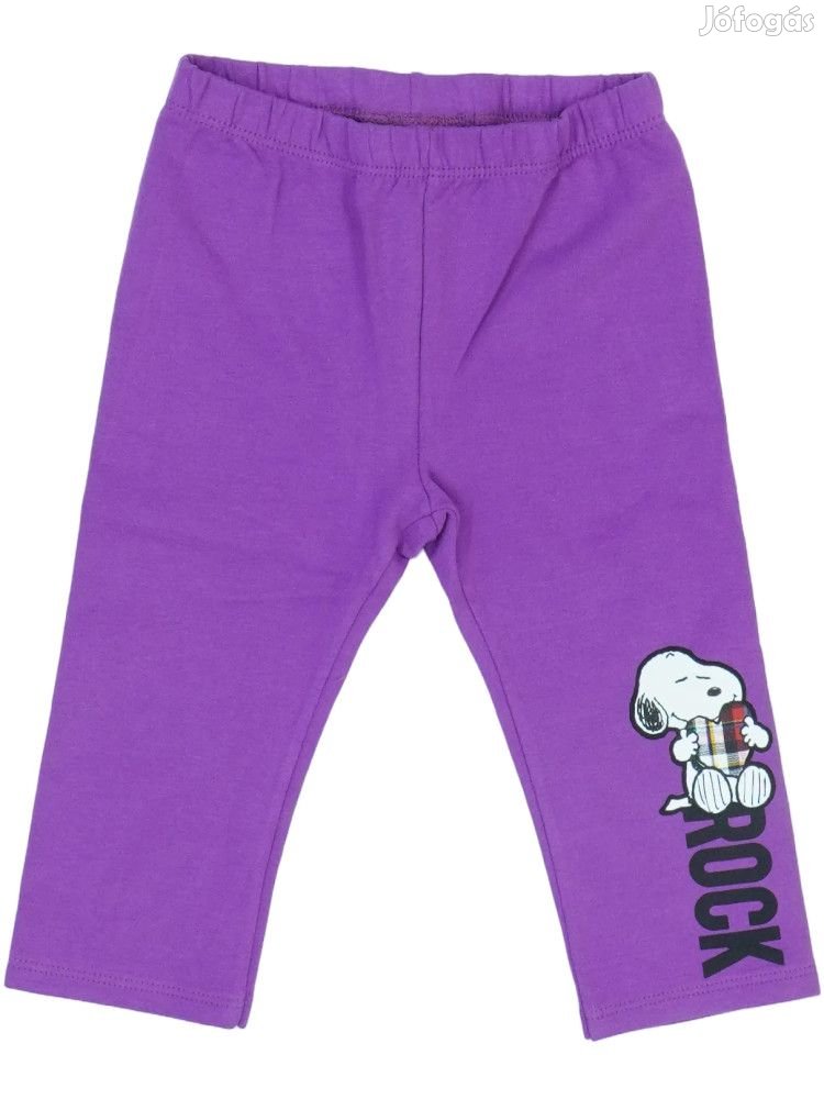 Lila színű lányka leggings Snoopy karakterrel és 'ROCK' felirattal. A nadrág rugalmas, gumis derékrésszel rendelkezik, amely kényelmes viseletet biztosít. A jobb lábszáron nagy méretű Snoopy ábra található, aki egy mikrofont tart a kezében, alatta pedig a 'ROCK' felirat olvasható fekete betűkkel. A leggings puha, stretches anyagból készült, amely követi a mozgást és hosszú távú kényelmet nyújt. Ideális választás mindennapi viseletre vagy játékra. Az élénk lila szín és a kedvelt mesefigura teszi különlegessé ezt a praktikus ruhadarabot.