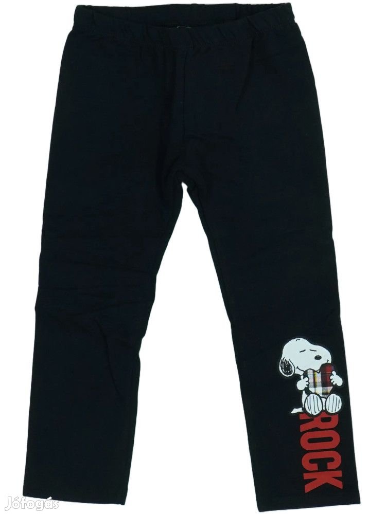 Fekete színű lányka leggings Snoopy karakterrel és 'ROCK' felirattal. A nadrág rugalmas, gumis derékrésszel rendelkezik, amely kényelmes viseletet biztosít. A jobb lábszáron nagy méretű Snoopy ábra található, aki egy mikrofont tart a kezében, alatta pedig a 'ROCK' felirat olvasható fekete betűkkel. A leggings puha, stretches anyagból készült, amely követi a mozgást és hosszú távú kényelmet nyújt. Ideális választás mindennapi viseletre vagy játékra. Az élénk lila szín és a kedvelt mesefigura teszi különlegessé ezt a praktikus ruhadarabot.