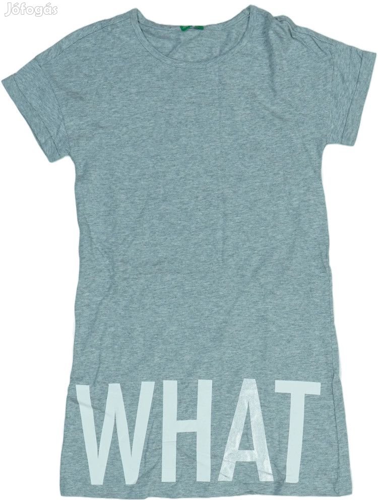 Szürke színű lánykaruha 'WHAT' felirattal az alsó részen. A ruha melange hatású anyagból készült, rövid ujjú és környakú kialakítással. A fehér betűkkel nyomott 'WHAT' felirat a póló aljánál található, ami modern és trendi megjelenést kölcsönöz. A darab kényelmes viseletű, hétköznapi használatra tökéletes választás. Az egyszerű, de stílusos dizájn révén könnyen kombinálható más ruhadarabokkal. A póló puha anyagú és kellemes tapintású, ideális választás aktív gyerekeknek.