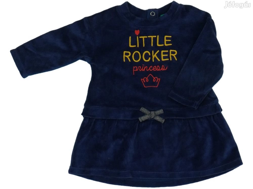 Elegáns hosszú ujjú, plüss kislány ruha sötétkék színben, amely tökéletes választás kisebb lányok számára. A ruha elején színes 'LITTLE ROCKER Princess' felirat látható sárga és piros betűkkel, alatta egy piros korona mintával. A derékrészen dekoratív fekete masni található, amely kiemeli a ruha bájos jellegét. A ruha puha anyagból készült, kényelmes viseletet biztosít. A nyakrésznél patentos megoldás könnyíti az öltözést. Ez a játékos és stílusos darab remek választás hétköznapi viseletre vagy különleges alkalmakra egyaránt.