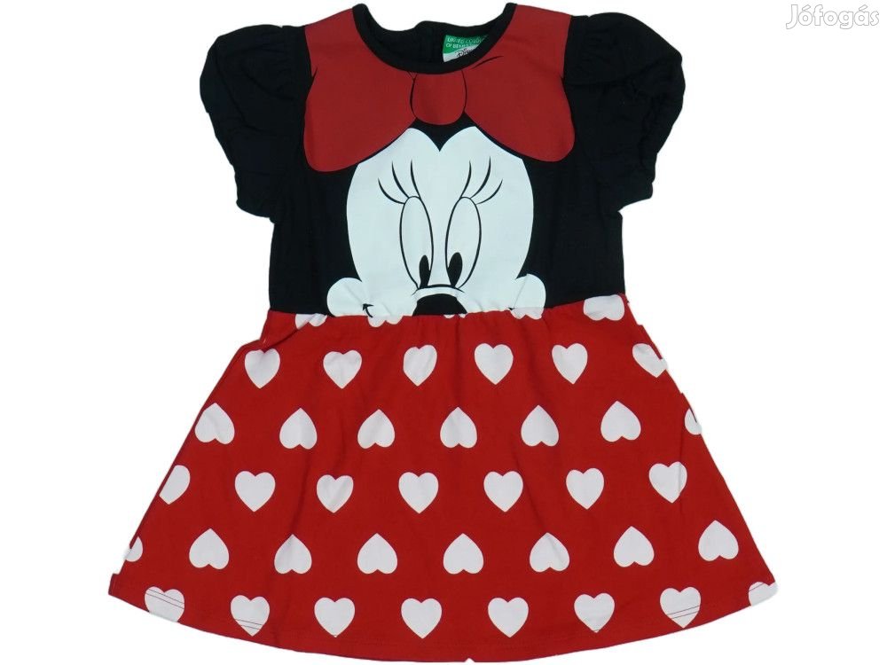 Bájos lányka ruha fekete felsőrésszel és piros szoknyarésszel. A felsőrészen Minnie egér karaktere látható nagy fehér fejjel, fekete szemekkel és piros masnival. A piros szoknyarészt fehér szívecskék díszítik egyenletes mintázatban. A ruha rövid puffos ujjakkal készült, környakú kivitelben. Az A-vonalú szoknyarész kényelmes viseletet biztosít. Kiváló választás Disney rajongó kislányoknak mindennapi vagy alkalmi viseletként. A fekete és piros színkombináció klasszikus és elegáns megjelenést kölcsönöz.