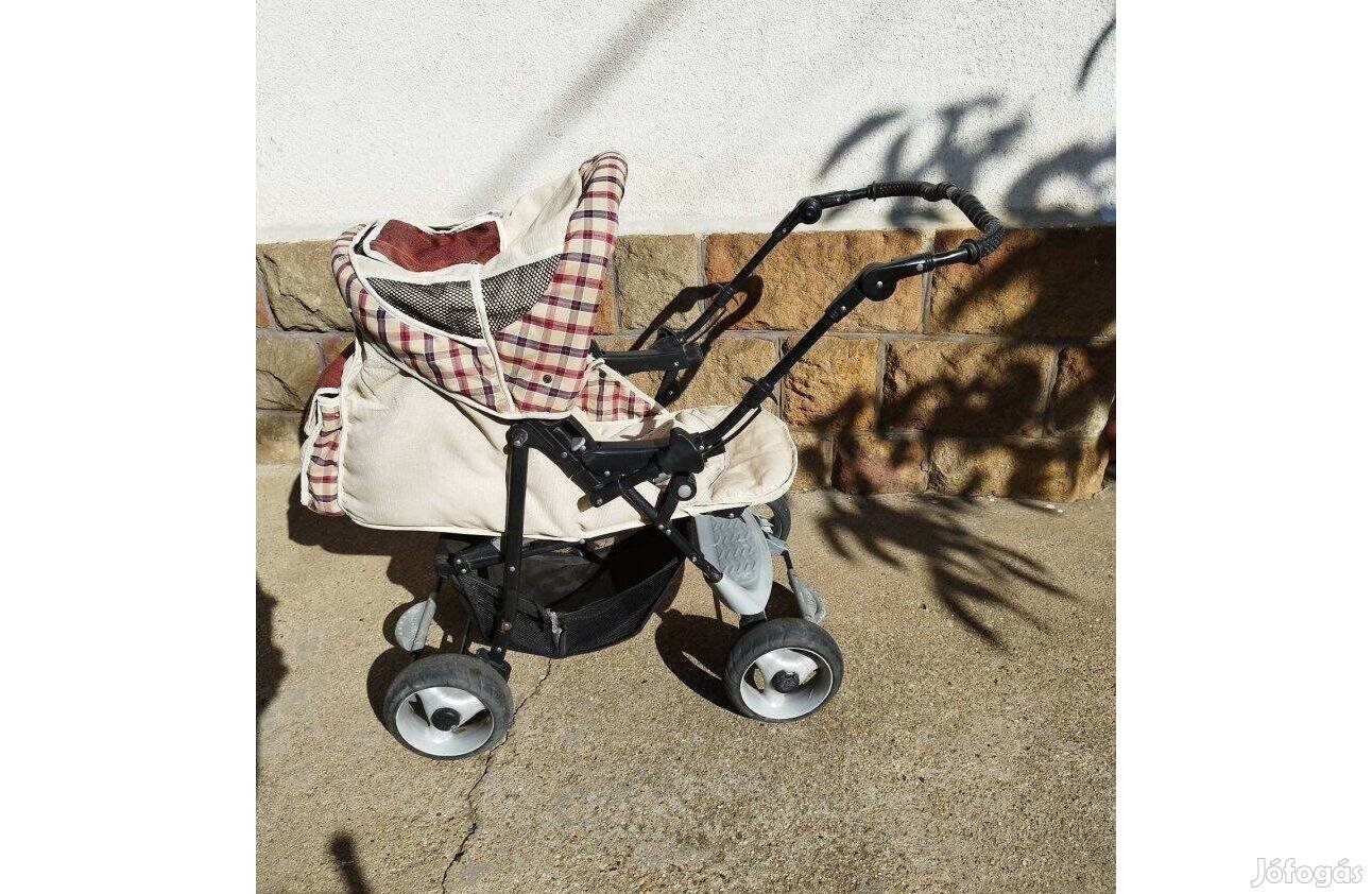 Eladó a képen látható használt, Bergon babakocsi, több funkciós. Hibája, hogy felül a háló ki van szakadva, keréknél egy kis festék kopás.