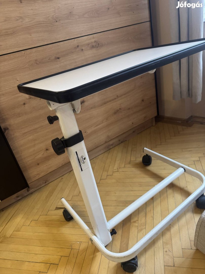 Emelhető,állítható,dönthető,fékezhető kis asztal.Megkönnyíti a beteg ágyban történő étkezését.Asztallap mérete 56cm*40cm.