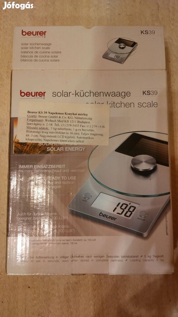 Vadonatúj német Beurer KS39 napelemes konyhai mérleg eladó. Nem kell hozzá elem, beltéri fényben is tökéletesen működik, pontosan mér, minőségi termék.