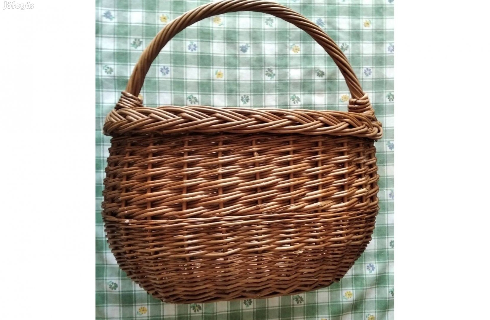 Retro ovális fonott vesszőkosár, anyaga fűzfa. Külső méretei: Hossz: 36 cm, Szélesség: 25 cm Kosármagasság: 25 cm (füllel együtt 40 cm).