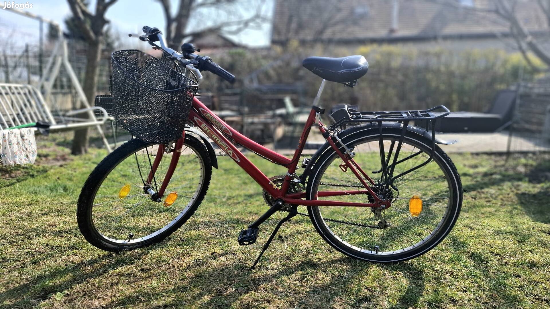 Eladó használt bicikli 26-os, váltós, hátsó piros lámpával, első kosárral, hátsó csomagtartóval, csengővel, kerekekben defekálló feltöltéssel