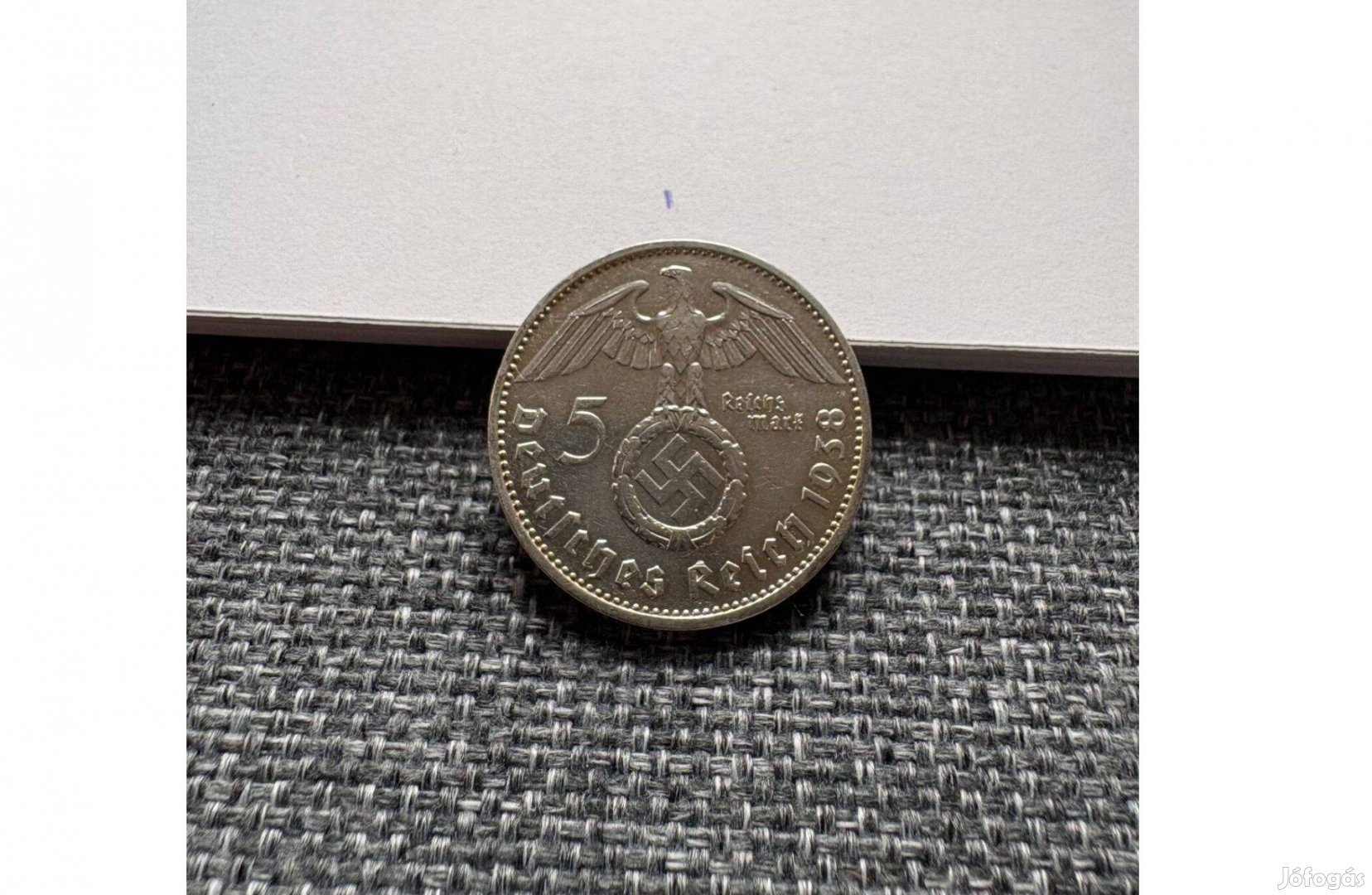 1938 F verdejelű birodalmi ezüst 5 márka a képek szerinti nagyon szép állapotban (XF+ aUNC).