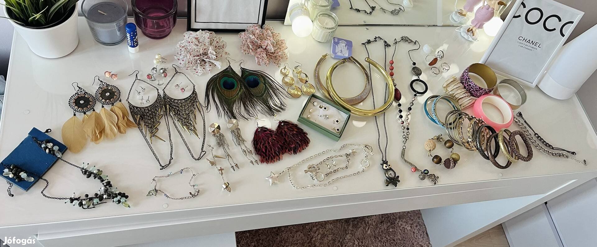 Nagyon sokminden van benne. Sok karkötő, sok fülbevaló, nyakláncok, néhány gyűrű, 1 db bokalánc, szettek stb. Több mint 60 darab. Némelyiken van oxidálódás, de van köztük sosem használt is. Többhöz adom az eredeti dobozát + 1 db díszdobozt.