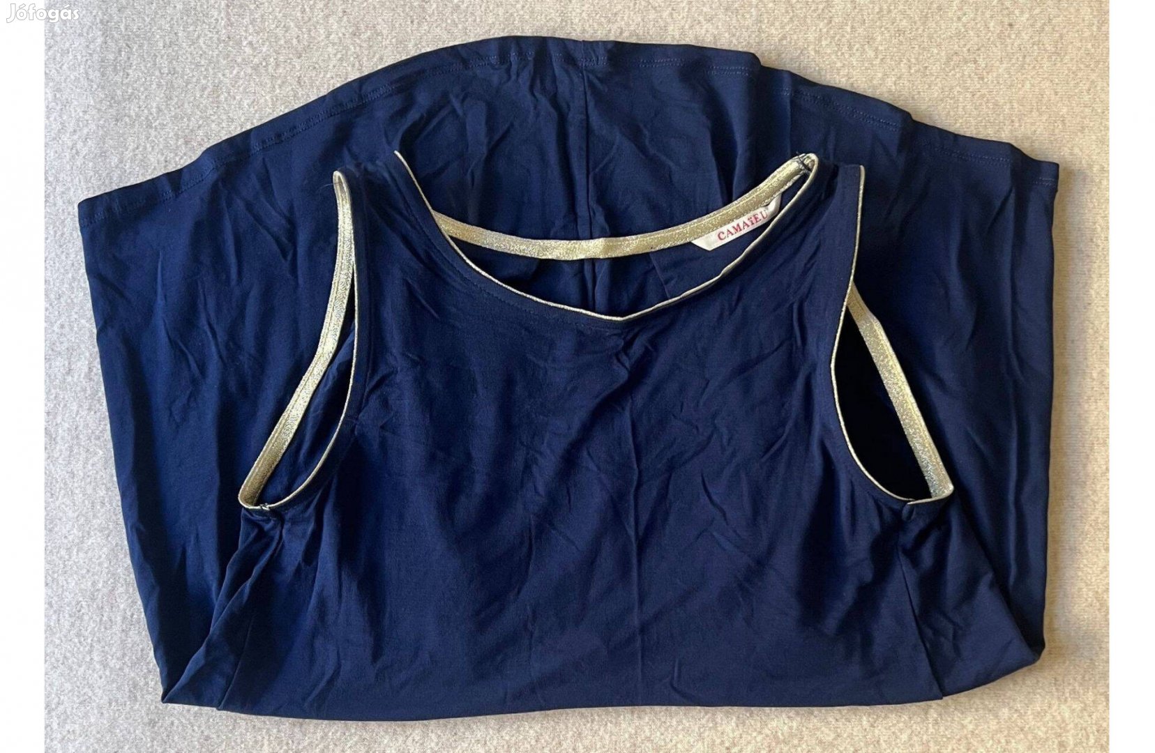 Új ujjatlan, kerek nyakú, bő fazonú női felső eladó. Egyszerű bő fazonja ellenére mégis nagyon elegáns, alkalmi viselet az anyaga miatt is, mely önmagában is különleges, de a csillámló szegélyei még inkább egyedivé és ünnepivé varázsolják. Kerek nyakú, hátul kivágott, húzott, mély dekoltázs. Harang fazonú.