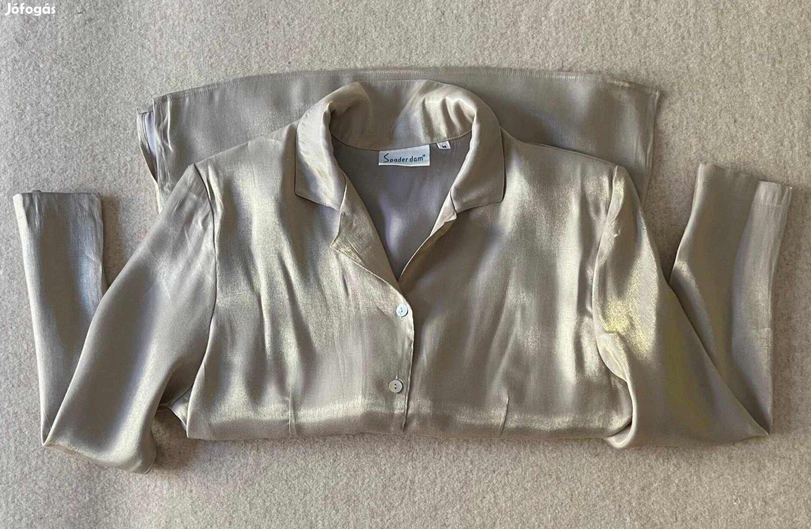 Újszerű, kiváló állapotban lévő arany szálakkal átszőtt anyagból készült női blúz eladó. Klasszikus galléros, elöl gombos, alul kétoldalt fel sliccelve, hosszú ujjú. Gyönyörű csillám szőttes. Karácsonyi ünnepi öltözéknek vagy szilveszteri bulira ideális öltözék!