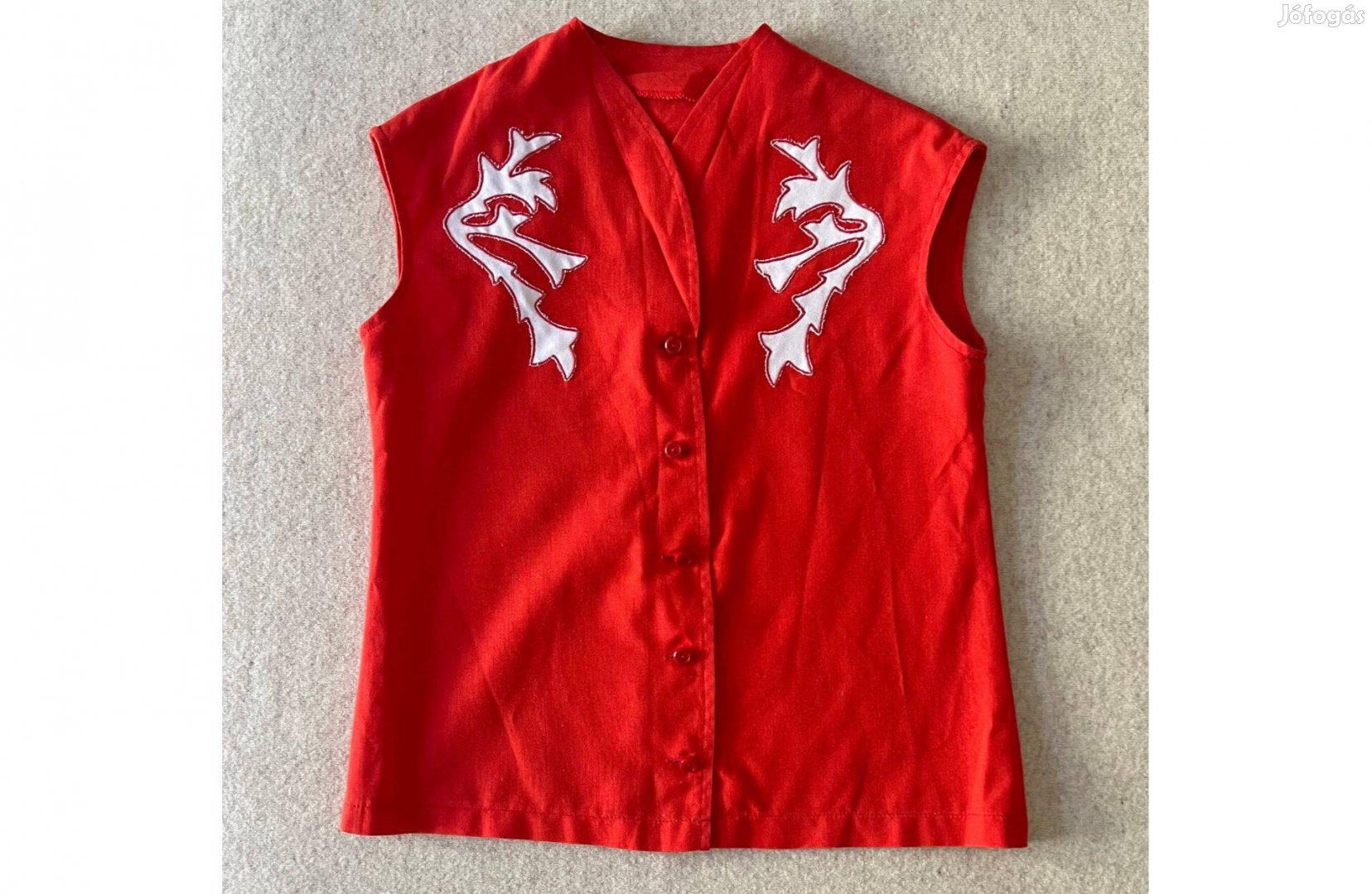 Újszerű, kiváló állapotban lévő egyedi, méretre készült női blúz eladó. Egyenes fazonú, ujjatlan, sálgallérszerű, hat gombbal gombolódik.