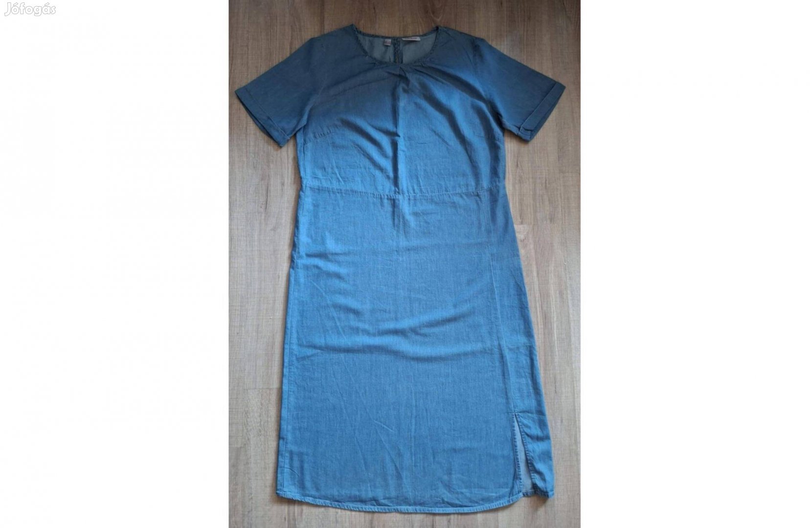 Pár alkalommal hordott, kék színű, egyenes szabású, rövid, visszahajtott ujjú farmerruha, oldalán hasítékkal.