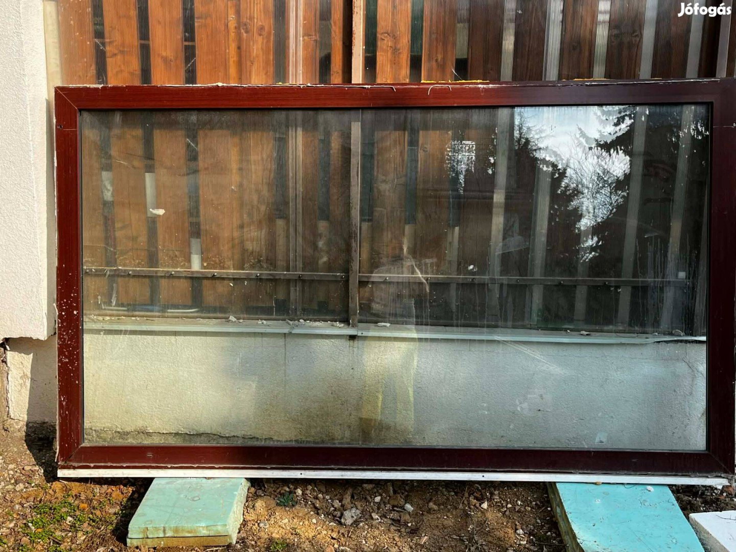 Bontott két rétegű műanyag ablak, belül fehér, kívül dió/mahagóni színű. 280 cm széles 160 cm magas, fix.