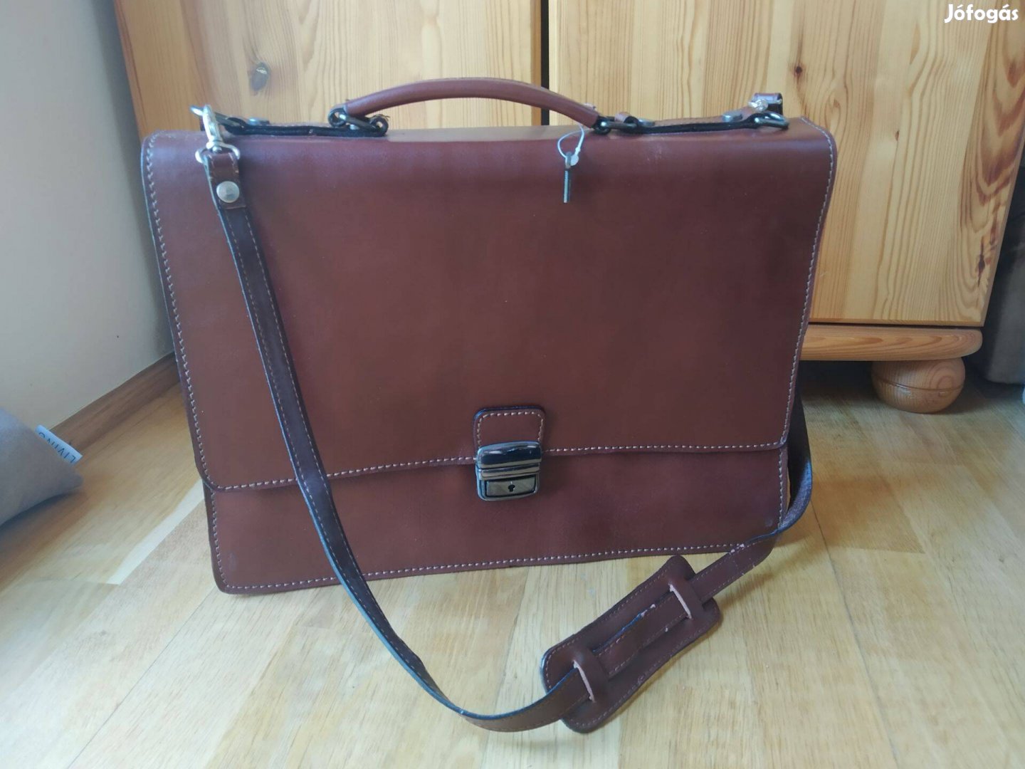 Eladó a képeken látható, új (sosem használt), barna bőr aktatáska. Kizárólag a vállpánt része kopott, amiről külön kép is található, minden más teljesen új állapotú. A mérete 37.5 cm hosszú, 27.5 cm magas és a maximális szélessége (eddig bővül, eddig pakolható tele) 11 cm.