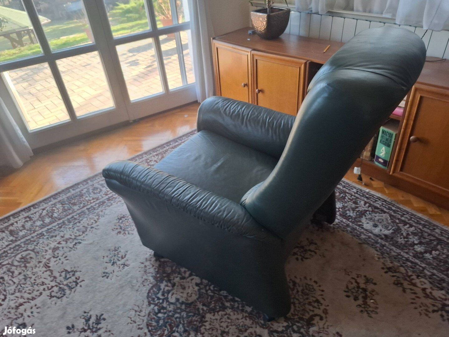 Szép, mélyzöld bőr fotel , jó állapotban,nyitható lábtartóval. Nem sérült. Fotókon jól látszik remélhetőleg!