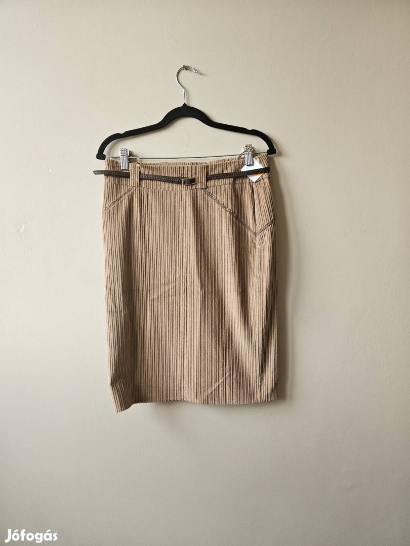 Tevebarna színű, bordázott kord anyagból. Övbújtatós, az öv a szoknyához tartozik. Hátul cipzárral záródik, középen 21 cm felsliccelt.
