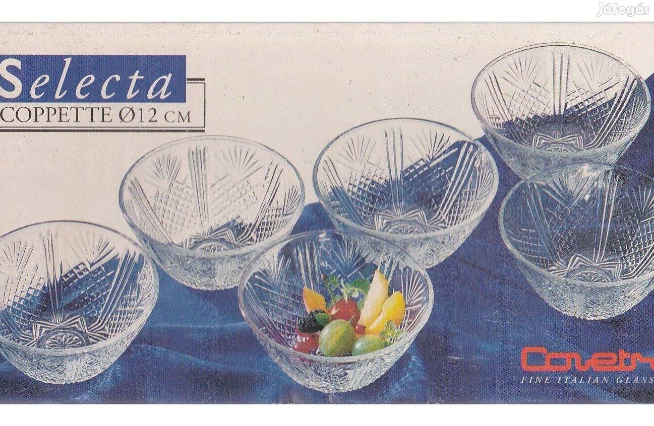 Bormioli Rocco minőségi olasz csiszolt üveg tálaló / kínáló készlet, hibátlan állapotban, eredeti dobozában. Kompót, desszert, gyümölcs stb. tálalásához az asztal dísze lehet ez a finoman elegáns, szép kidolgozású készlet. A szett 6 db 12 cm átmérőjű üvegtálat tartalmaz.