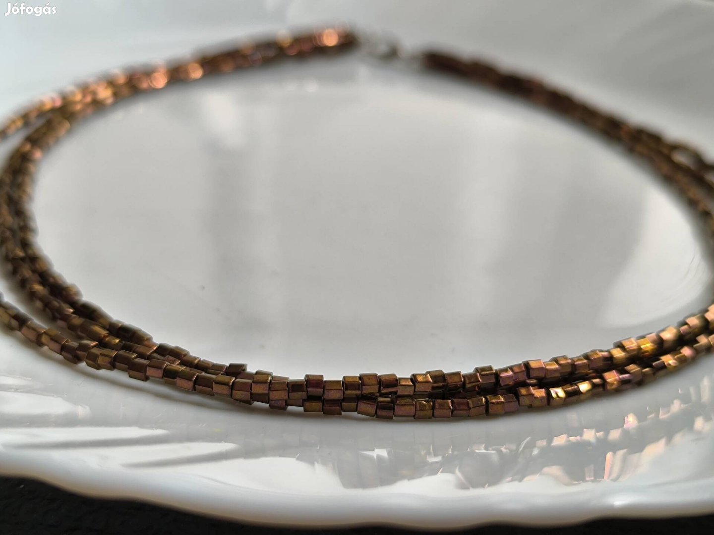Fémes hatású, bronz színű gyöngyökből készült háromsoros nyaklánc.
