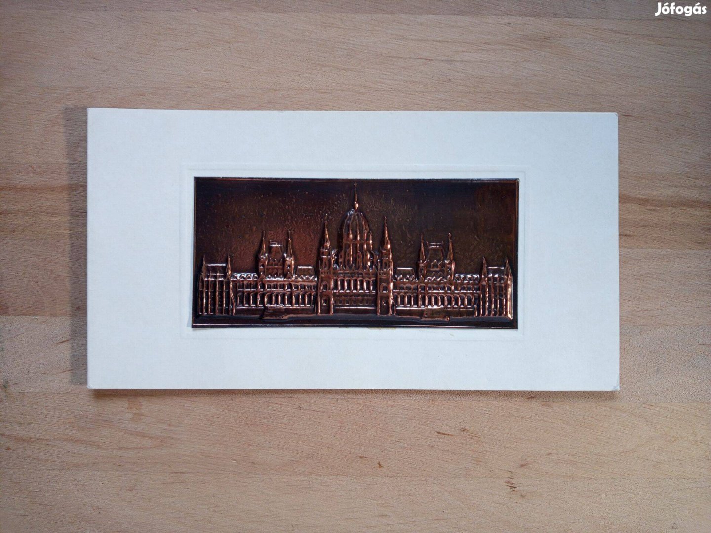Retró képeslap Budapest Országház domborított vörösréz lemezen még vörös csillaggal,