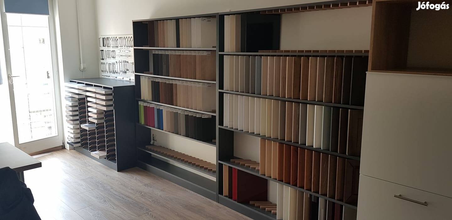 Munkalap tartó állvány (a kép bal oldalán) és hozzá kb 30-40db munkalap minta (Egger, Forest)