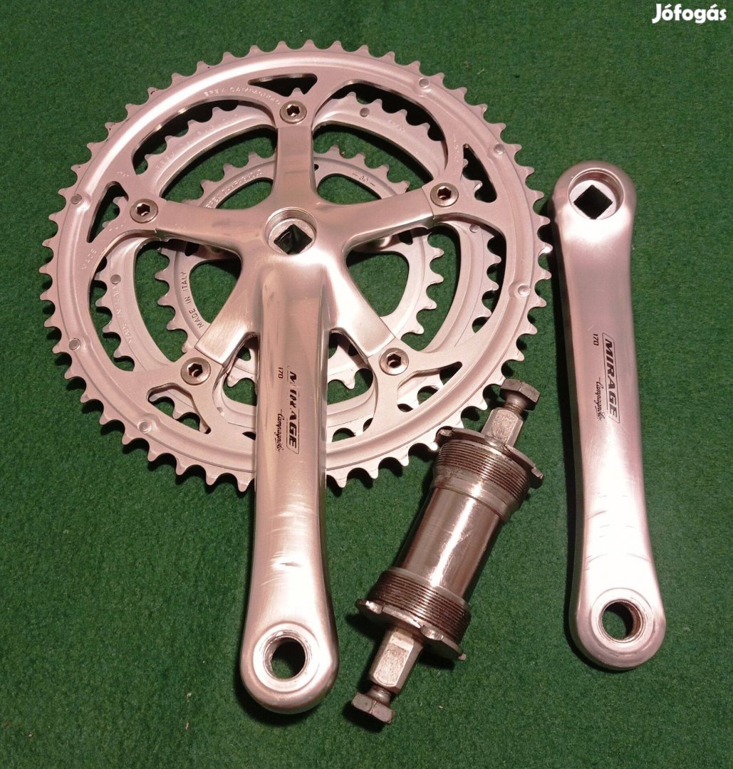 A hozzá tartozó középcsapágy olasz menetes, 111mm, eredeti Campagnolo csavarokkal.