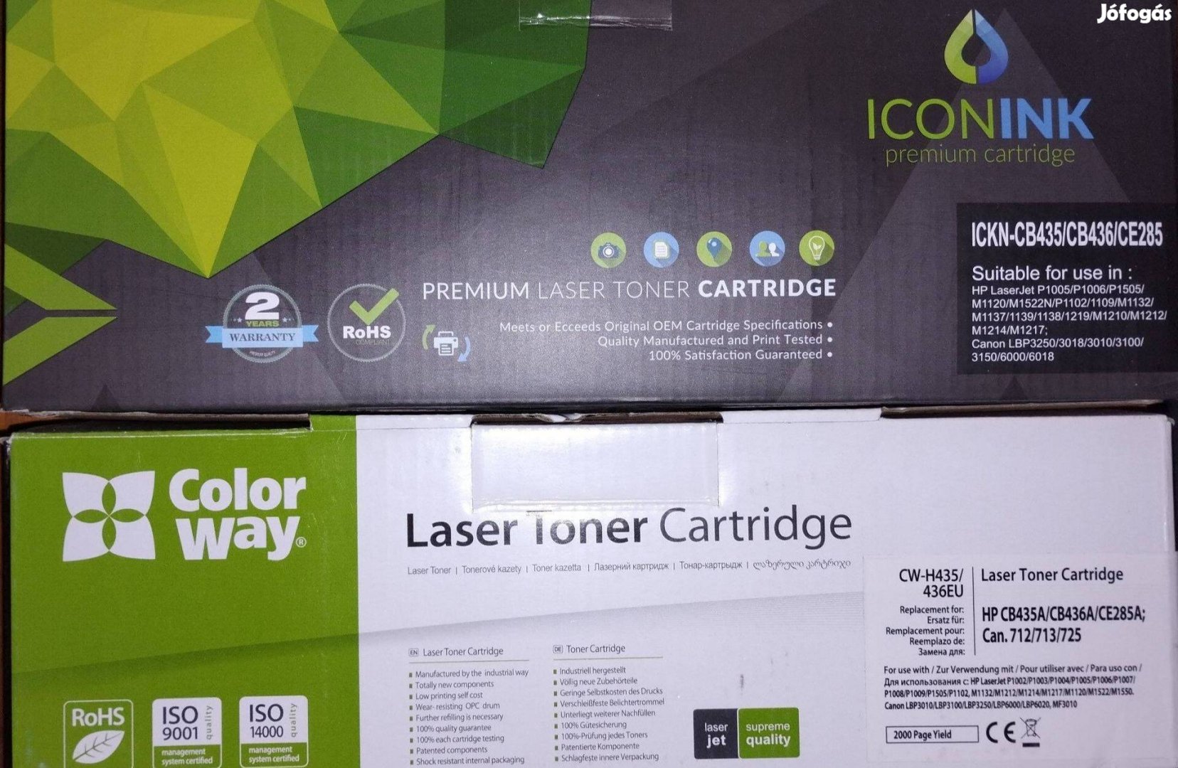 Összesen 2 db Hp 435 vagy Canon 712 kompatibilis utángyártott toner. Csak kibontva lettek a kompatibilitás kipróbálásához. Hozzá való nyomtató már régen nincs meg. Nálam csak a helyet foglalják. Gyártási év kb. 2018-2019.