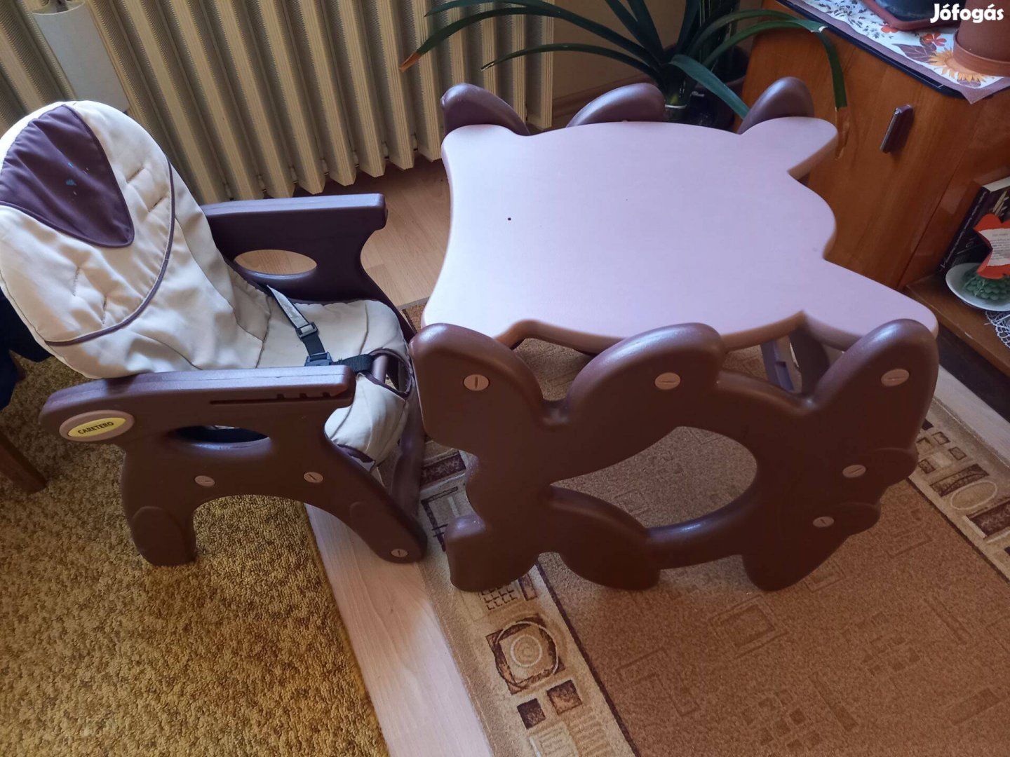Eladó a képen látható 7 hónapos kortól használható, támla állítással, biztonsági övvel felszerelt etetőszék. Könnyen mozgatható, stabil, jól tisztítható. Kisszékké, asztallá alakítható.