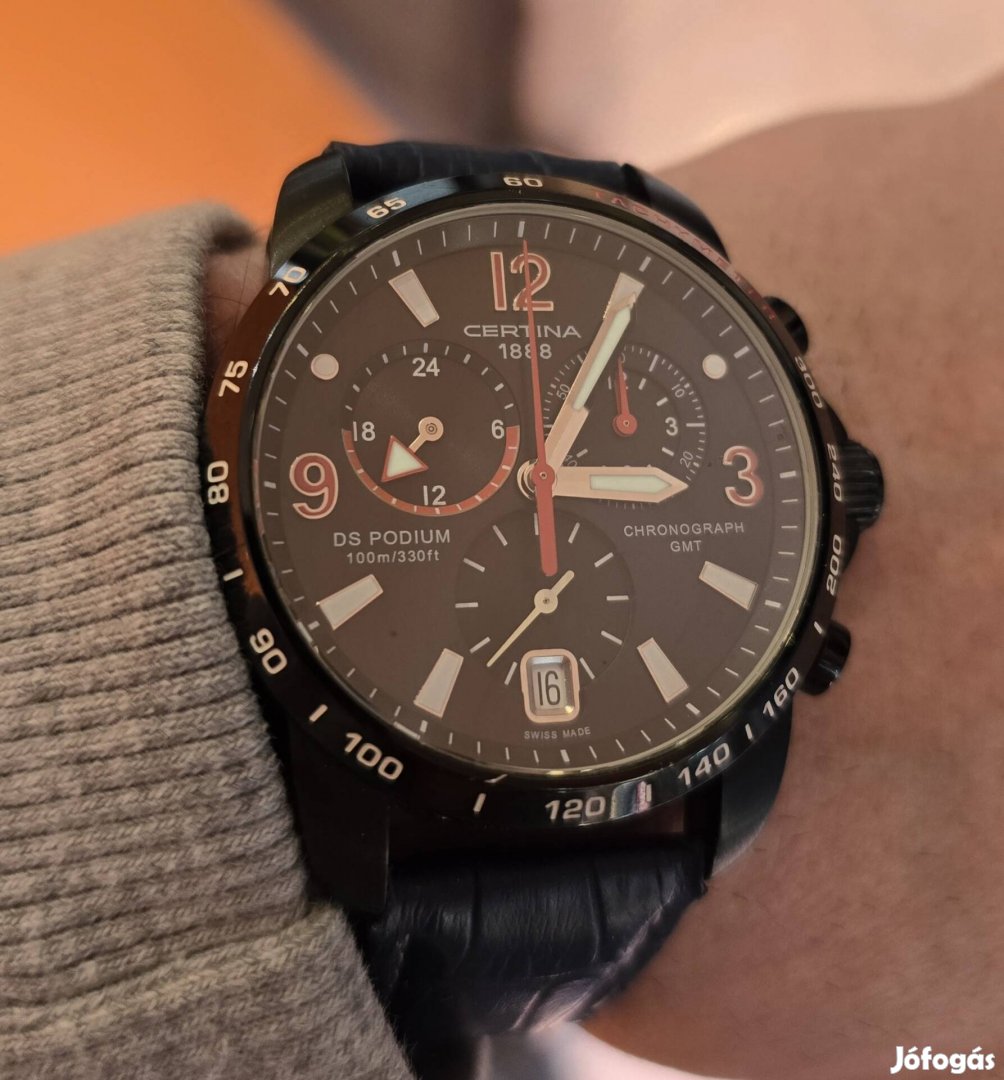 Használt de hibátlan állapotú és működésű Certina Ds Podium Gmt Chrono quartz wr100-as acéltokos zafír üveges Svájci óra eladó.