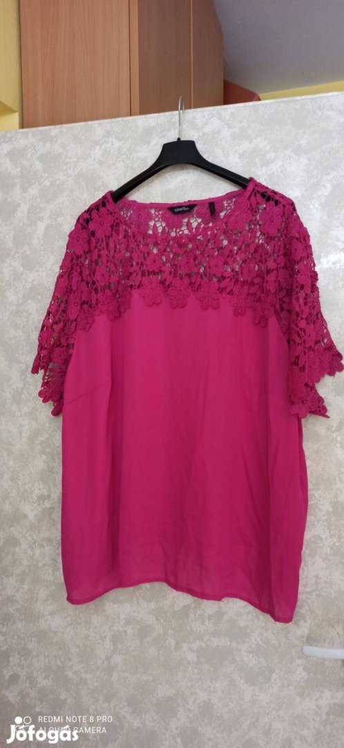 Ciklámen színű felül csipkés rövid ujjú muszlin blúz 58-as méretű, új állapotú 2800 Ft-ért eladó.