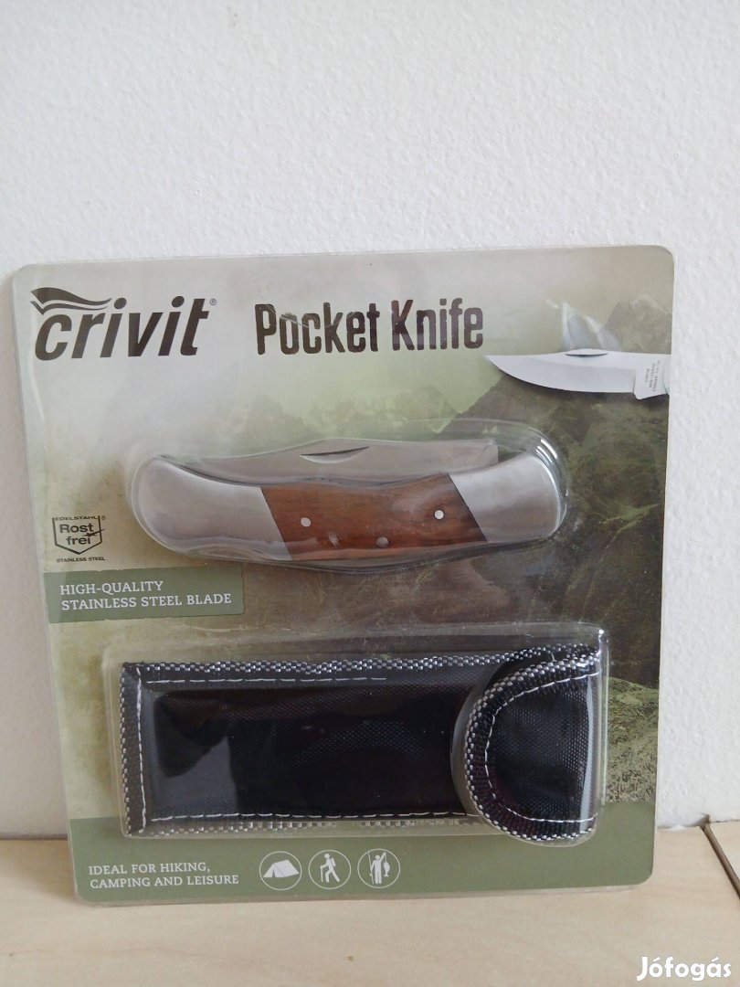 Crivit összecsukható zsebkés, rozsdamentes, nagyon éles, fém és fa nyéllel. Magas minőségű acél. Övre akasztható tartóval. Ideális kiránduláshoz.
