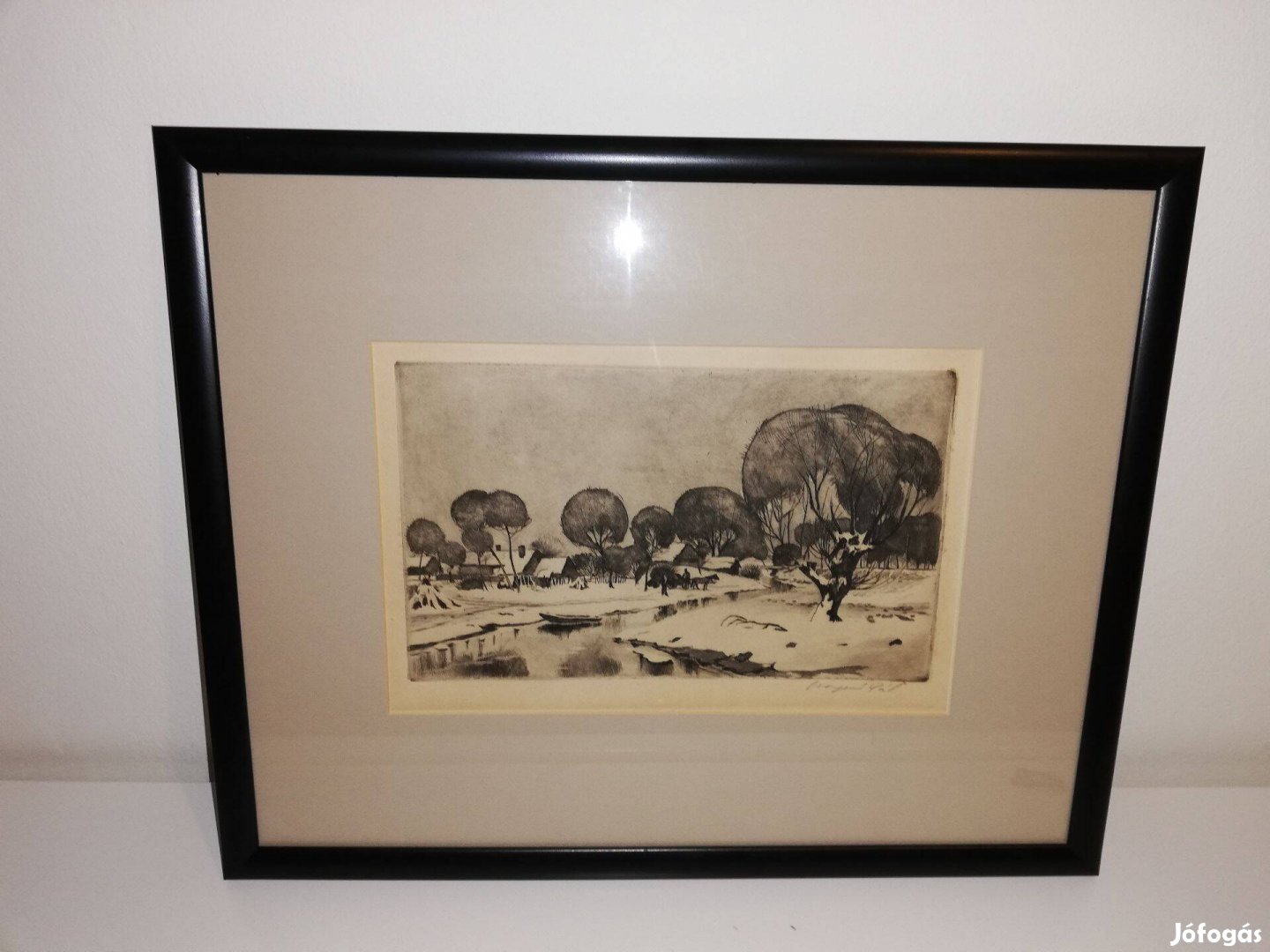 Csergezán Pál 20. századi grafikus, illusztrátor alkotása cca. 1966. Szignózott, eredeti jelzett rézkarc. A művészre jellemző természeti téma: havas patakpart, vagy holtág. A kép mérete: 17x29 cm. Keretezett méret: 41x51 cm. Újrapaszpartúzva, üvegezve, fekete műanyag keretben. Korának megfelelő állapotú, a papír picit hullámos, de ez falra akasztva a keretben nem látszik.