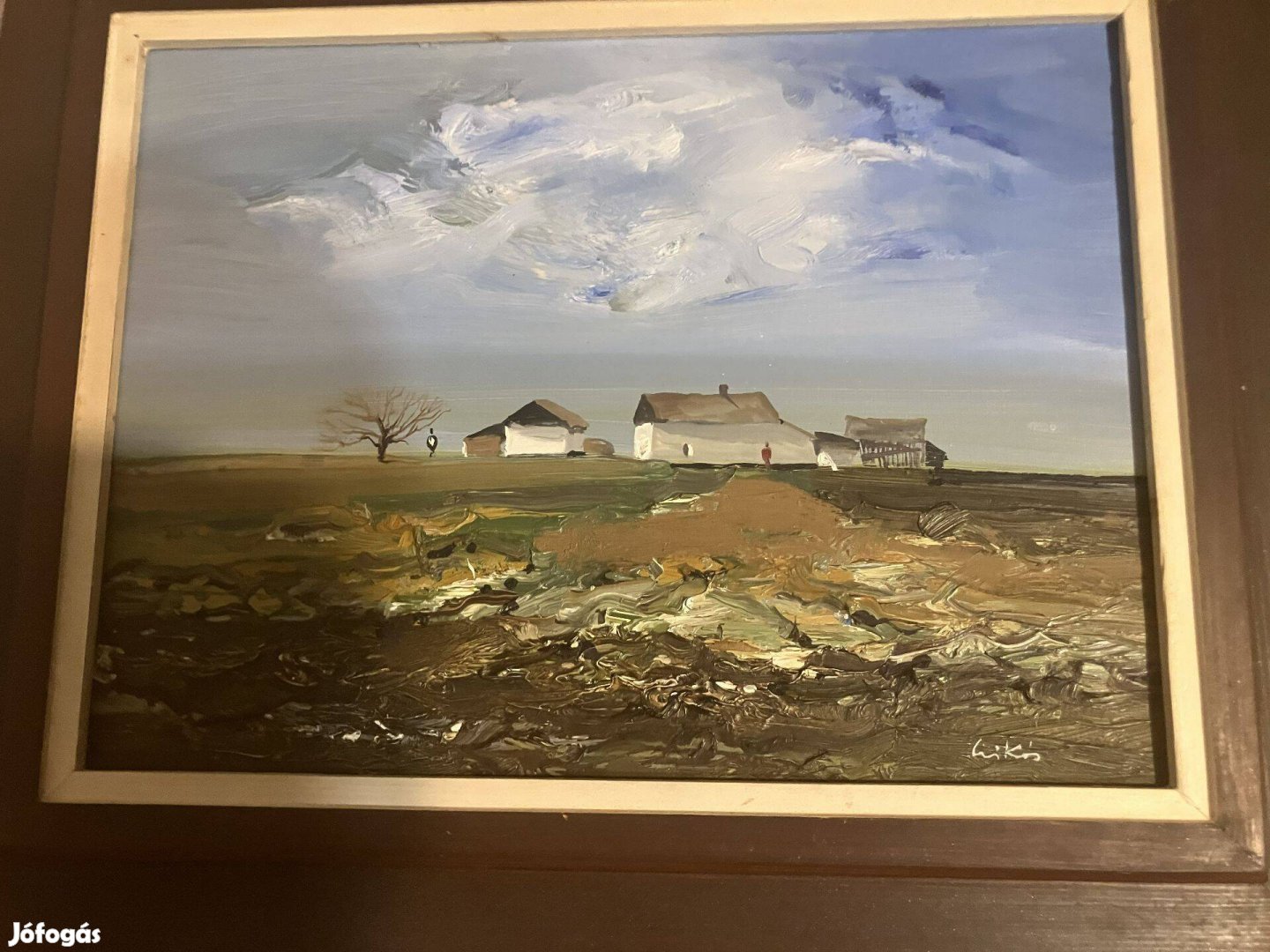 Élénk szinekkel megfogalmazott festmény a tavaszodó Alföldről. A földön még foltokban a hó, az elvékonyult felhő a hideg szelek hirnöke , a góré kiürült, de az emberek már tervezik a munkát. Nagyon szépek a fények. Igényes munka az életműből. 30x40 cm olaj farost