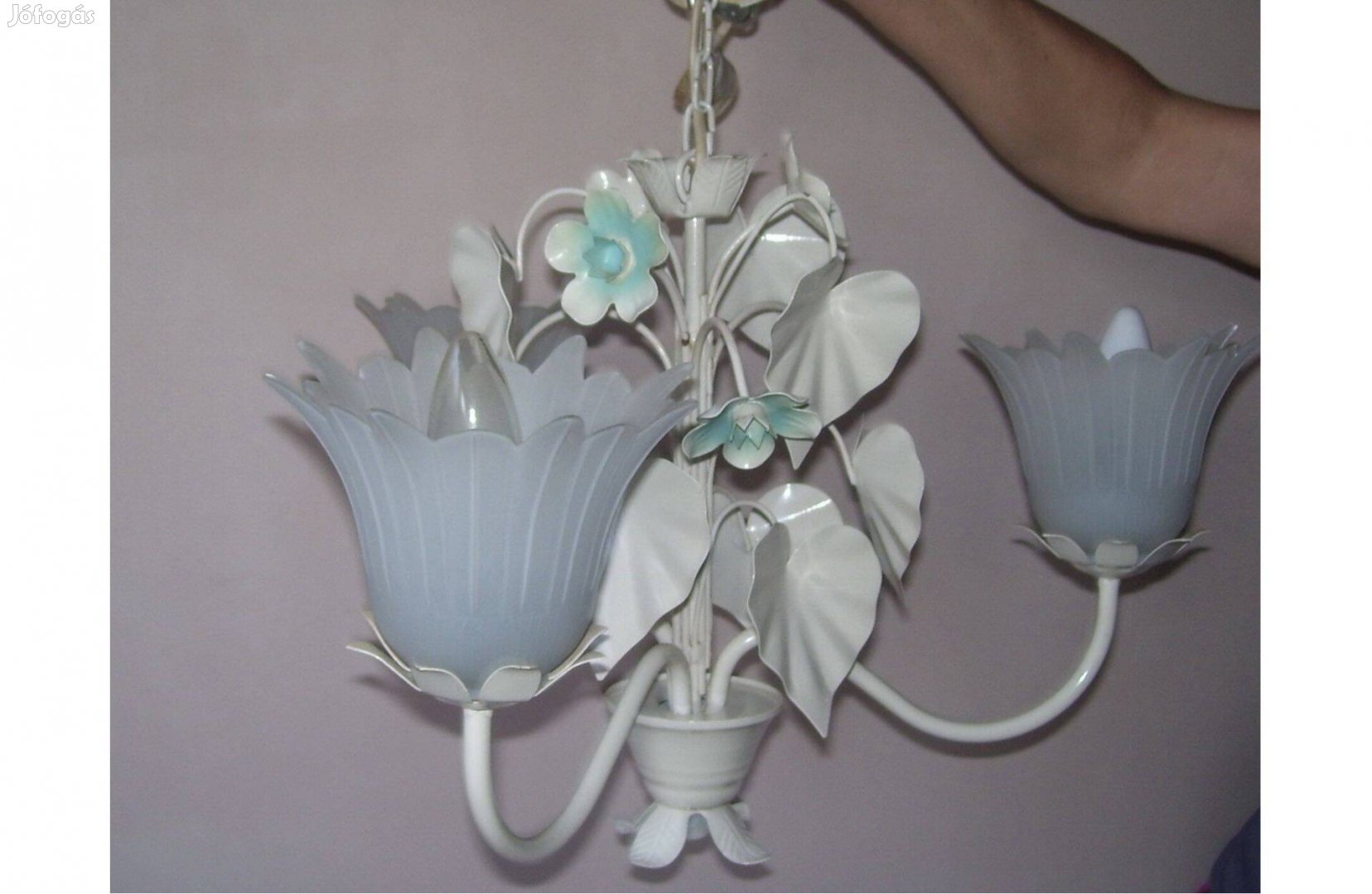 Újszerű, kiváló állapotban lévő háromágú kovácsoltvas, virág motívumos csillár eladó. Virág formájú üveg búrákkal. Normál foglalattal, égőkkel.