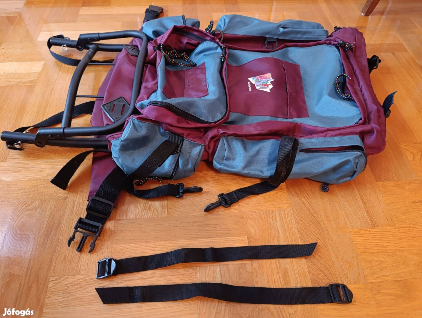 Ezt a hátizsákot több mint 20 éve egyszer használtam: egy balatoni táborhoz a vasútállomástól a szálláshelyig vittem benne a holmimat. Egyébként a szekrényben pihent és szerintem ha 20 évig nem kellett, akkor a jövőben sem fog. Tiszta, túrához alkalmas (de nem katonai minőségű) szövet, a mérete kb. 85x45x20 cm súlya minimális. 2 nagy rekesze van, oldalt még 2x2 zseb + a tetején plusz egy harmadik rekesz. Hátul egy pénztárca zseb, elöl pedig még 2 boríték méretű zseb. Az oldalzsebben 1,5 literes üditőspalack elfér ahogy a fotón látszik. A hálózsák, palack és a fürdőlepedő a fotón illusztráció nem tartozék!
