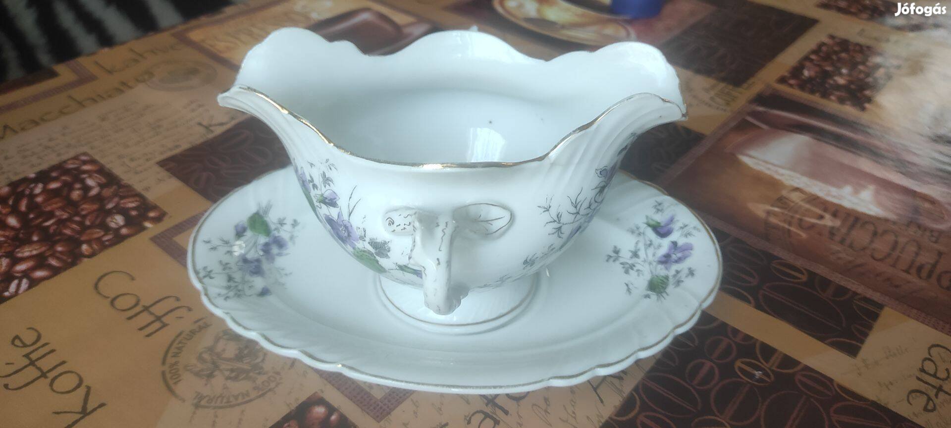 Cukortartó tálka alátéttel lila virágos, aranyozott, jelzés: 543 22