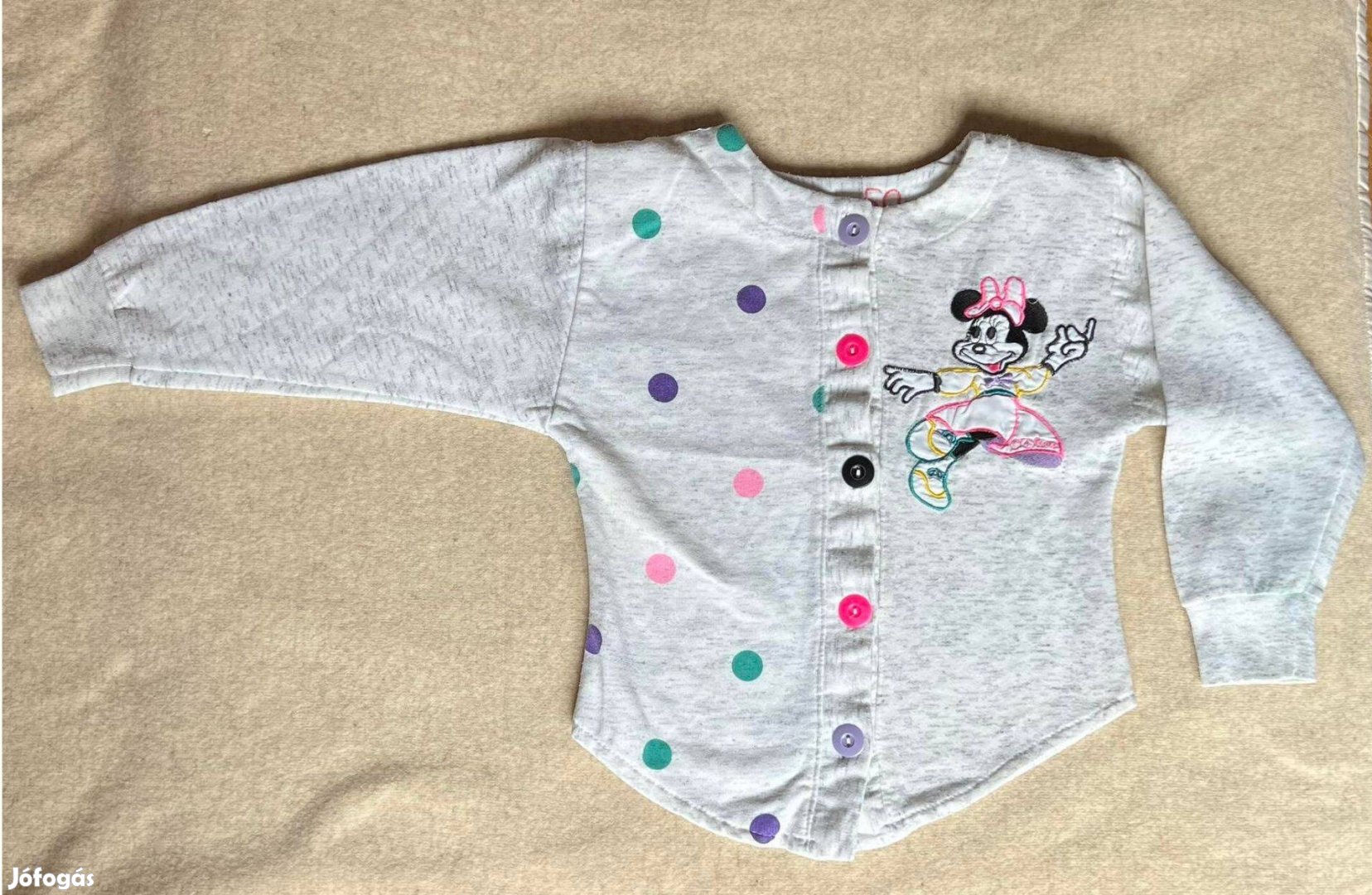 Színe: világos szürke, színes pettyekkel és gombokkal, színes Minnie egér hímzéssel.