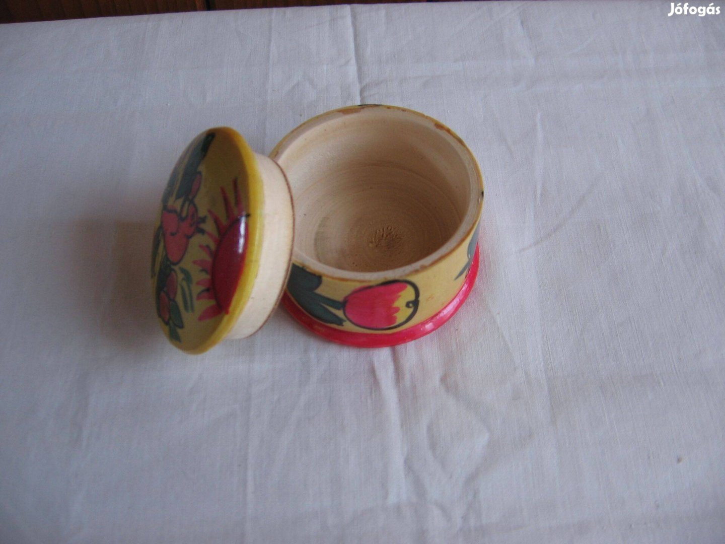 Kézi festésű, magassága 3,5 cm, átmérője 5,5 cm. Nagyon jól záródik, mintha dugó lenne.