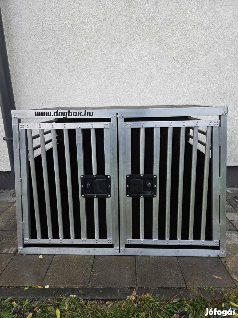 Eladó kutyaszállító box, dogbox dupla. Ford Kuga 2019.75 (2019/2) modellhez készült. A méretei. Alul: 102×72,5 cm. Felul: 93x58 cm és 70 cm magas. A hatulja kicsit dontott az eleje egyenes. Az ajtok szelessege: 41 cm. Kivehető elválasztóval középen két kutyához, kulcsokkal dupla zárral.