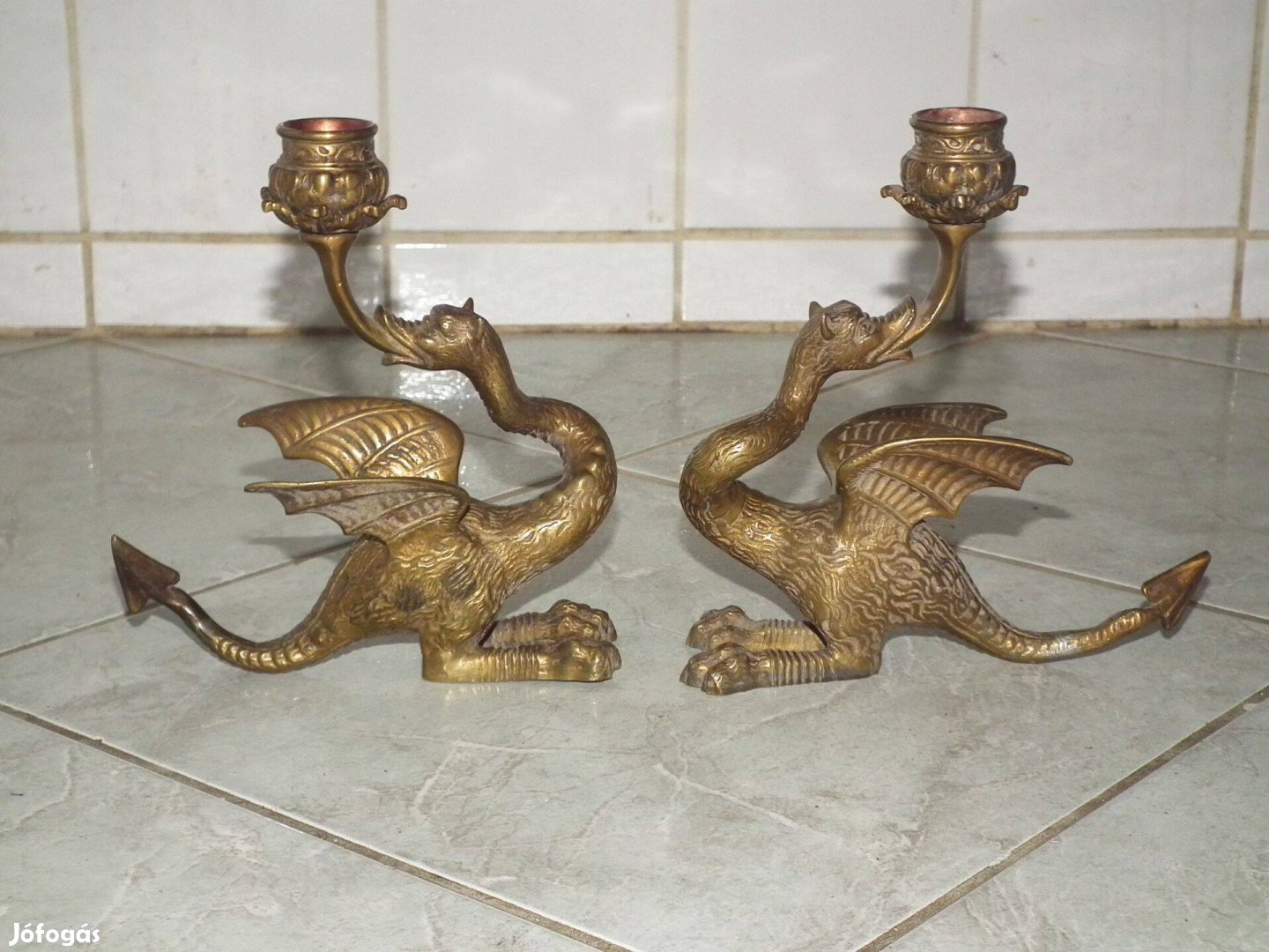 Dögnehéz ritka sárkányos réz gyertyatartó párban 2 db. egyben