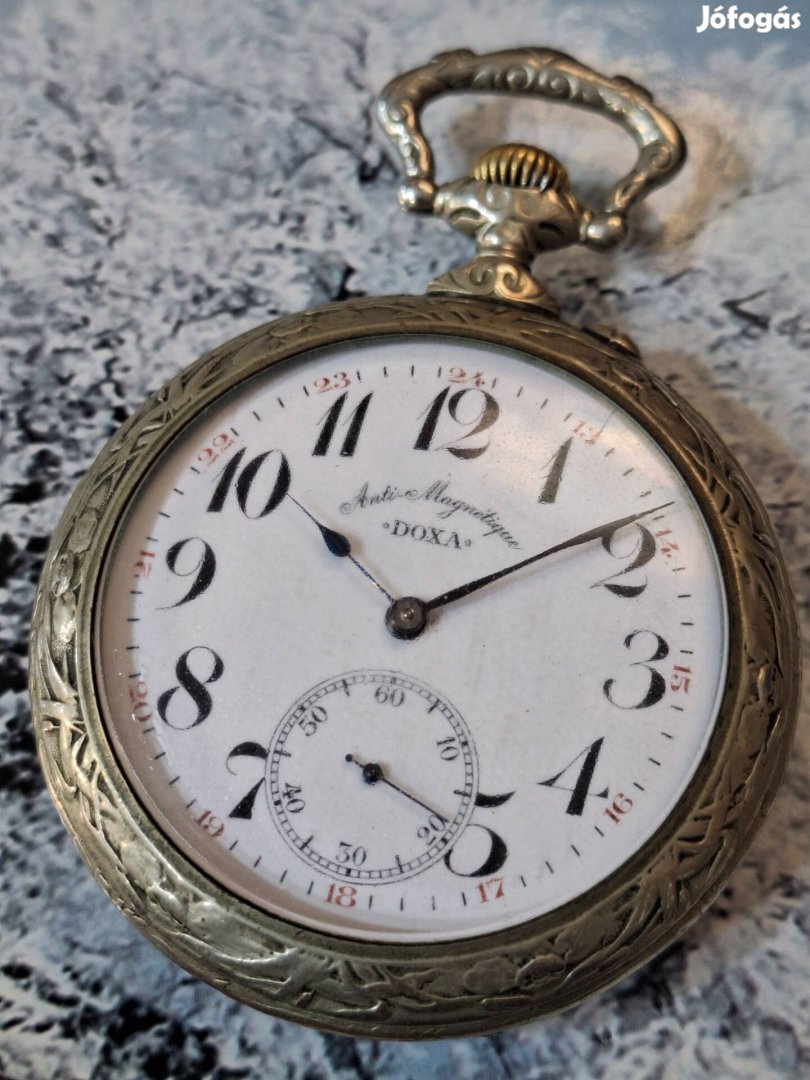 Doxa zsebóra nagyméretű, 70 milliméter átméröjü tokban. Oldaldrukkeres zsebóra tokja vadász jelentettel díszített. Működőképes állapotban kínálom.