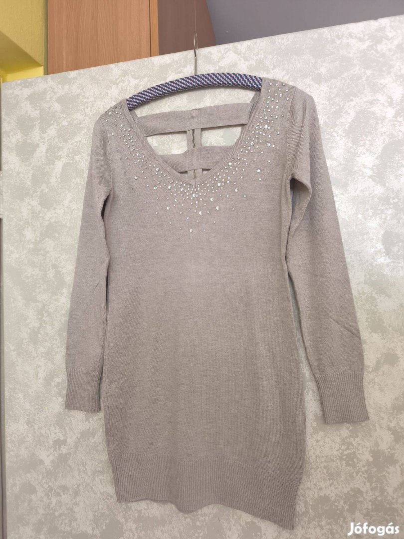 Drapp színű kövekkel díszített kötött pulóver, tunika, miniruha