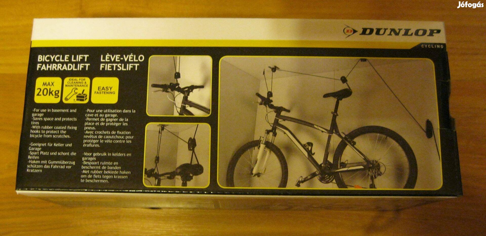 Eladó a képeken látható Dunlop márkájú kerékpárlift. Segítségével helytakarékosan tárolható a bringa (a plafonra rögzíthető, és a mennyezet alá fölemelhető vele)