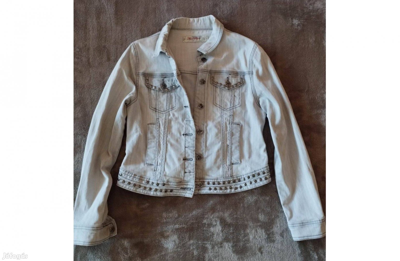 Használt, kiváló állapotban lévő nagyon csinos jó szabású női farmer kabát eladó. Nem bélelt őszi-tavaszi kabát, nyári hűvös napokon is jól használható. Fémgombbal gombolódik. Hagyományos galléros, egyenes szabású, rövidített derekú. Derekánál szegecses díszítés. Gyárilag koptatott.