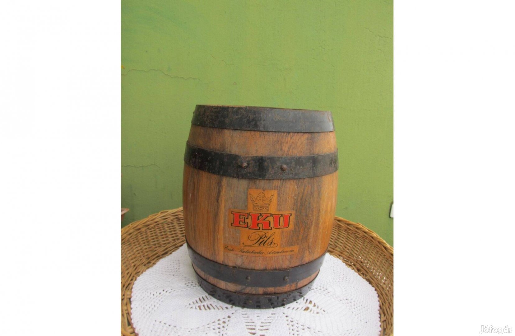 Eladásra kínálom a képen szereplő EKU Pils kis fa söröshordót. A képek magukért beszélnek. Körbe fotóztam. Az egyik teteje hiányzik, virágtartónak átalakított, de bármi tartó is lehet. Fa, vas abroncsokkal.