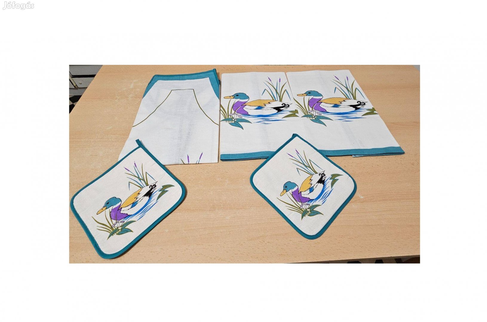 Eladóvá vált a képeken látható új edényfogó garnitúra : 1 db kötény, 2 db edényfogó, 2 db konyharuha aranyos kiskacsa mintával. Ideális főzéshez, sütéshez. Minőségi termék. A szett minden szükséges darabot tartalmaz, hogy a konyhában töltött idő biztonságos és élvezetes legyen. Ajándéknak is kiváló.