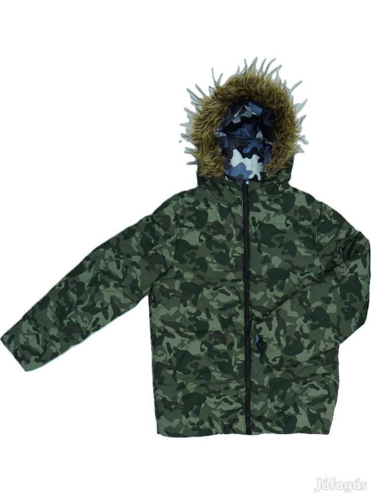 2-oldalon használható terepszínű, szőrmés kapucnis vastag kabát. Hiba: néhány apró szürkés folt a világos oldalán, az ujjakon - nem látványos