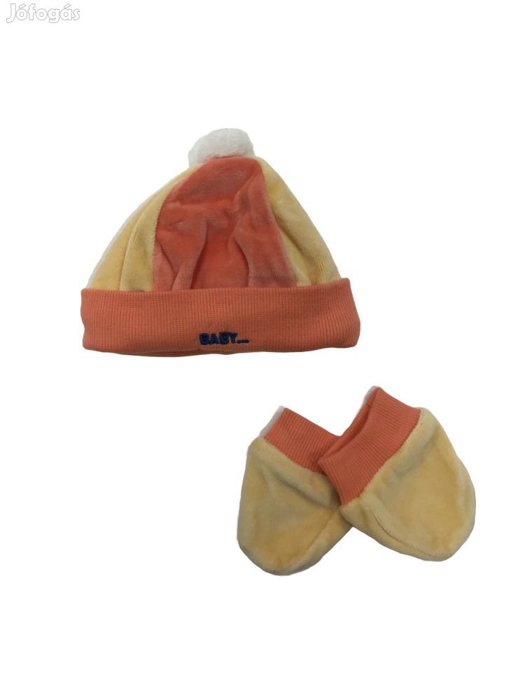 Sárga és narancs színű, bébi sapka és kesztyű